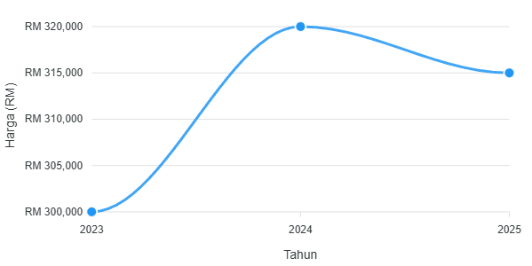 A: Harga rumah di Taman Puteri Wangsa menunjukkan trend menaik sejak 2023. Median harga meningkat dari RM300,000 (2023) kepada RM305,000 (2024), dan terus naik ke RM320,000 pada 2025 — kenaikan sekitar 7% dalam tempoh dua tahun.