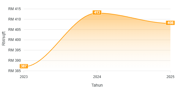 A: Harga per kaki persegi (PSF) di Taman Puteri Wangsa meningkat secara konsisten — dari RM382 (2023) kepada RM405 (2024), dan kini sekitar RM416 pada 2025. Trend ini menunjukkan nilai hartanah di kawasan ini semakin kukuh.
